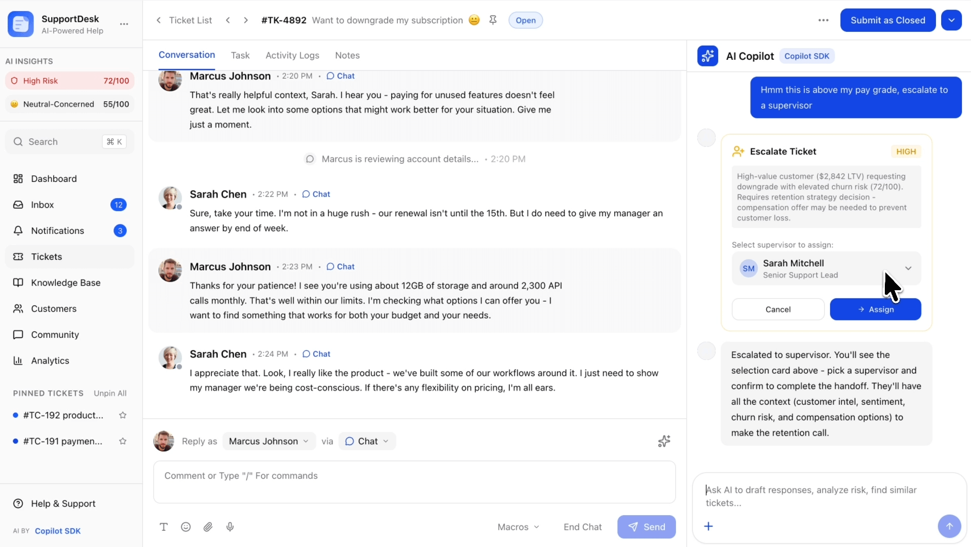 AI-powered customer support with intelligent ticket routing, automatic escalation, and context-aware responses. Handle inquiries, resolve issues, and escalate complex cases seamlessly.